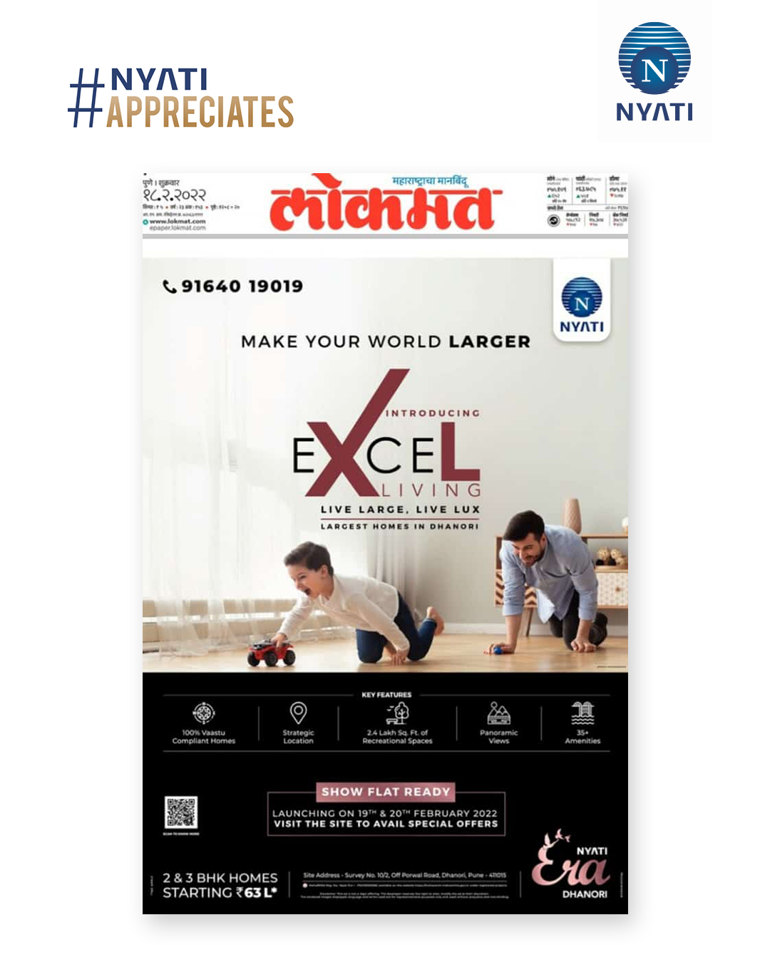 Nyati Era's Excel Lifestyle features on two of Pune's largest publications! Read more about the largest homes in Dhanori on the front page of today's Lokmat, and page 3 & 4 on Times of India! Join us at the Grand Launch on 19th & 20th February 2022 with special offers on 2 & 3 BHKs this weekend!